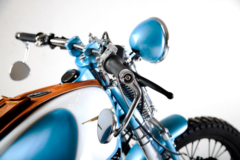 Классические линии мотоцикла довершает олдскульная круглая фара. Проводка была по возможности максимально спрятана, включая и новое электронное зажигание Dynatec. Пульты состоят из минималистичных кнопок, а в бак встроен GPS-спидометр для небольшого современного штриха.
