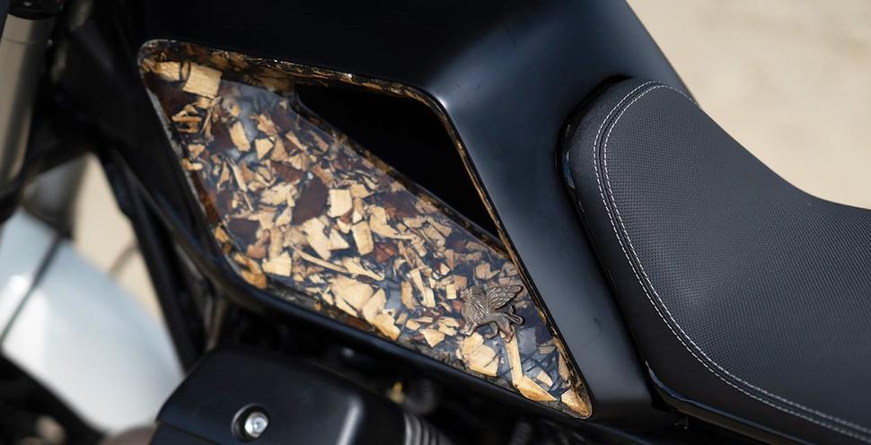 Суть этого дизайна в том, что он восходит к новой линейке продукции Vanguard, - объяснил Люк. -Дерево непросто встроить в существующий дизайн V85, и отсюда пришла сама идея сделать новый бак. Среди деревянных элементов находятся два бронзовых логотипа Vanguard ручной работы, выполненные Лизой Штолле - другом-ювелиром.