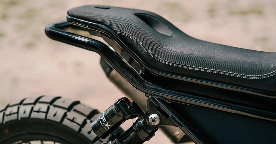 Над переделанным подрамником парит кастомное сиденье, обшитое главным местным спецом - Йероном из Silvermachine. Выемка на нём не просто так - туда вставляется ключ и сиденье снимается, давая доступ к баку, который теперь находится под седлом. Люк сделал его вручную из стали, установил на раму через резиновые проставки и вмонтировал в него штатный бензонасос.