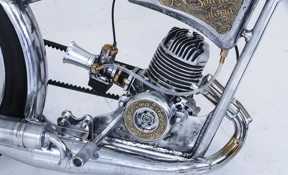 Мотоцикл получил кличку "Zwei", то есть "Два". Это потому, что он является своего рода продолжением другого мотоцикла, который Wannabe построили несколько лет назад. Маленький чоппер с обманчиво скромным электромотором весил всего 79,4кг, и тогда это казалось Рикки неплохим достижением. Но в честь 20-летнего юбилея своей мастерской он решил построить что-нибудь ещё более маленькое, лёгкое и бензиновое.