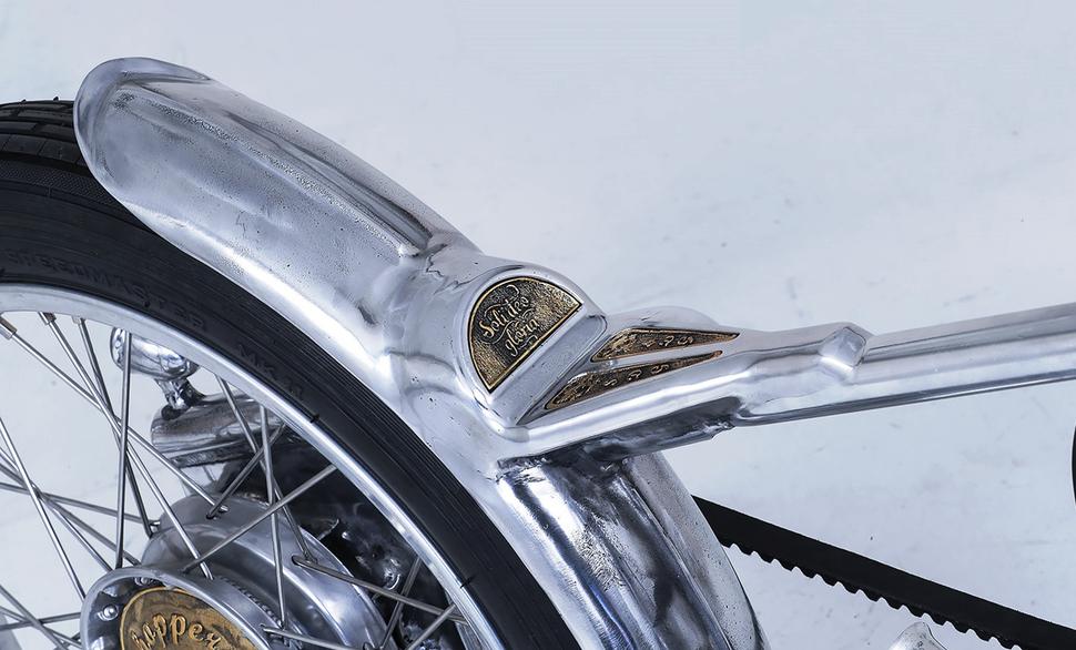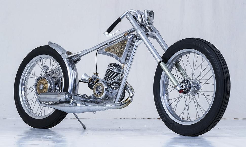 Литьё металлических деталей - одна из специализаций Wannabe, так что эта самоделка просто усеяна литыми алюминиевыми и латунными украшениями. Элементы ручной работы красуются буквально на всём, от крышек двигателя и крышки ступицы заднего колеса и до бесчисленных латунных деталей, которые заменяют все пластиковые части карбюратора.