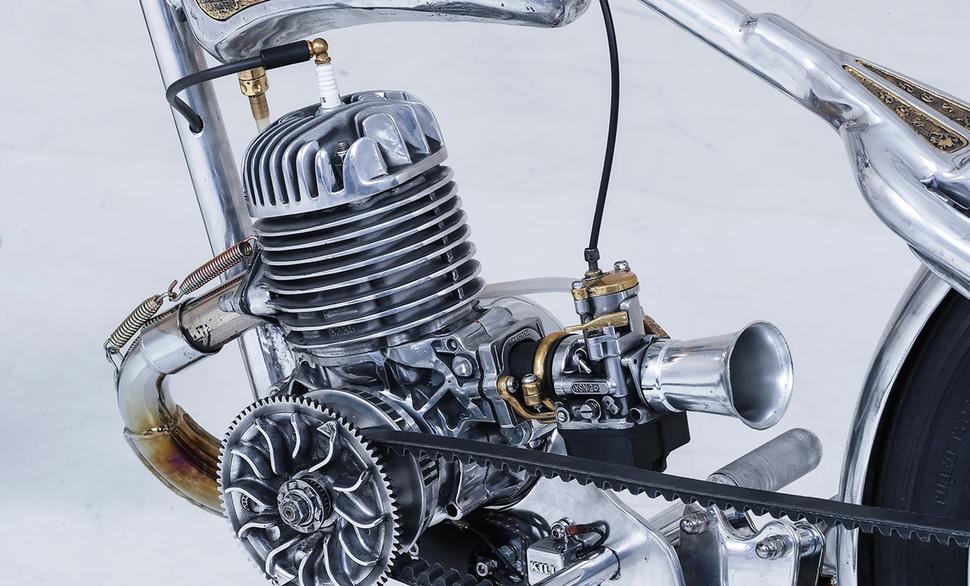 В нижней части рамы приютился уникальный двухтактный мотор, собранный из удивительно разномастных запчастей. Картер был изготовлен из кусков двигателя Vespa, который Wannabe порезали, сварили вместе и украсили литыми элементами. Цилиндр и головка - это сильно модифицированные детали от Malossi. Ещё двигатель отличает коленвал под высокую степень сжатия, внутреннее роторное зажигание и карбюратор YSN. Даже резиновый впускной коллектор был сделан с нуля - трудоёмкий процесс для почти невидимой детали. Тяга передаётся на заднее колесо через самодельный ремённый привод с вариаторной трансмиссией и центробежным сцеплением.