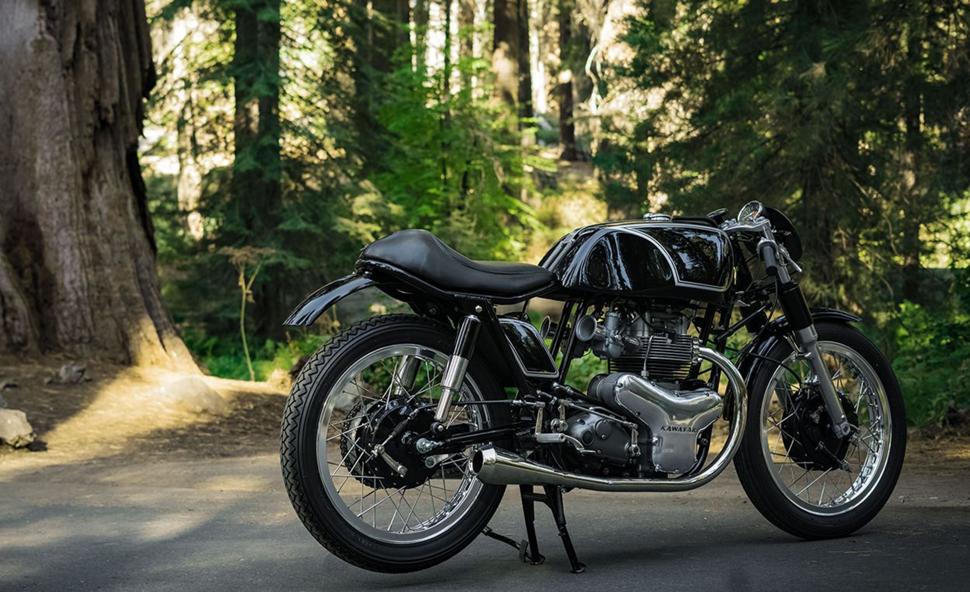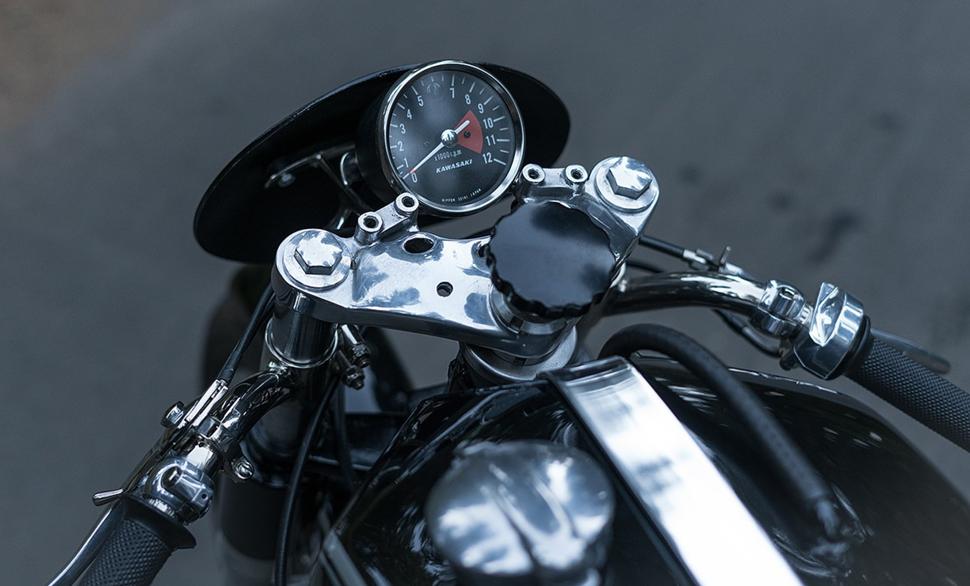 В остальном мотоцикл представляет собой сборище различных запчастей Kawasaki, мастерски соединенных вместе: передний тормоз от 1965 W2650, руль от KZ440, грипсы от Kawa A7, дроссель от F21M “Green Streak”, первого серийного Kawasaki, окрашенного в фирменный зеленый цвет.