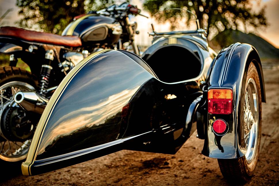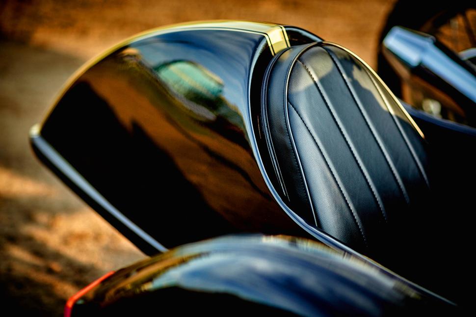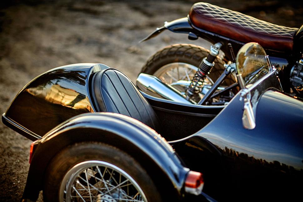 Рама Triumph Thruxton была укорочена, крылья модифицированы под стиль коляски. Затем оба, мотоцикл и коляска, были любовно покрыты богатым глянцевым чёрным с великолепной золотой окантовкой, а рамы окрашены порошковой краской для надёжной защиты от коррозии. Как и пассажир, райдер получил кастомное сиденье, обшитое натуральной кожей с диагональной прострочкой, и грипсы руля были одеты под стать. Сзади мотоцикла установили амортизаторы YSS, рассчитанные под дополнительную нагрузку из-за коляски - и всё было собрано воедино.