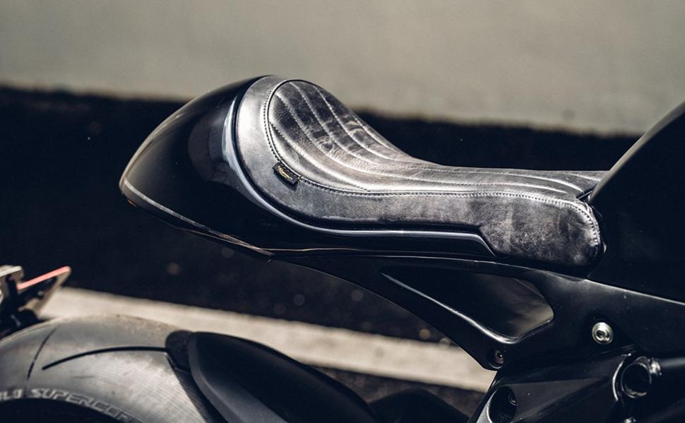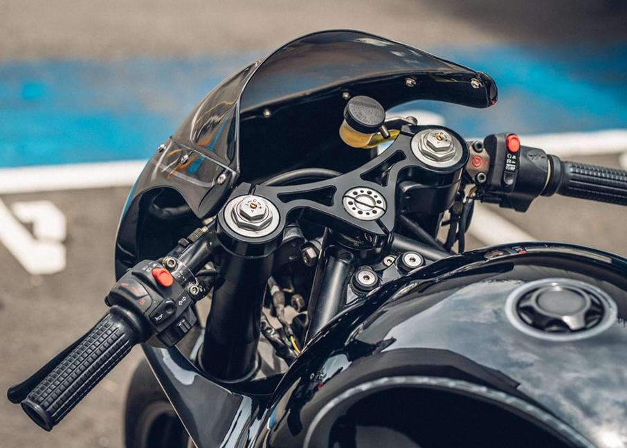 Заключительной частью стала установка улучшенного мастер-цилиндра Brembo и чёрных анодированных грипс Motogadget. Назад было установлено сделанное вручную крепление номера и маленький диодный фонарь. И хотя без этого можно было обойтись, Чун установил практически незаметные поворотники от Motogadget. Переднее крыло изготовлено вручную, а задний хаггер остался штатным. Колёса мотоцикла обуты в Pirelli Diablo Supercorsa SP V2s, а стильная чёрно-золотая цепь EK гармонирует с передними суппортами.