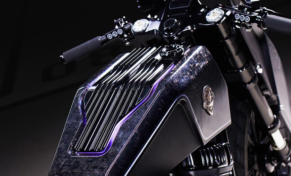 Этот Harley Davidson Street Bob, названный Cosmos Charger, представляет собой дикий футуристичный кастом, наполненный тщательно продуманными деталями. Судя по ранним наброскам Уинстона, он действительно мучился, пытаясь найти баланс между крутизной и классическими решениями. И действительно, как добавить диодную подсветку на мотоцикл, не превратив его при этом новогоднюю ёлку?