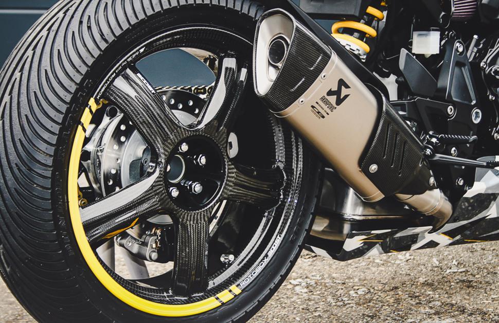 Колеса тоже выглядят будто из космической эры, что не удивительно, ведь это колеса из углеволокна от Rotobox. Они на 50% легче оригинальных ободов и являются единственными в мире цельными колесами из углеволокна. С помощью Дарио из 442 мастера Rotobox сделали невозможное, чтобы успеть к 2019 Swiss Moto Show. Размеры ободов составляют 17×3,50 спереди и 17×6,00 сзади. Они обуты в дождевые гоночные шины Dunlop Moto 2, подчеркивающие уникальный внешний вид мотоцикла.