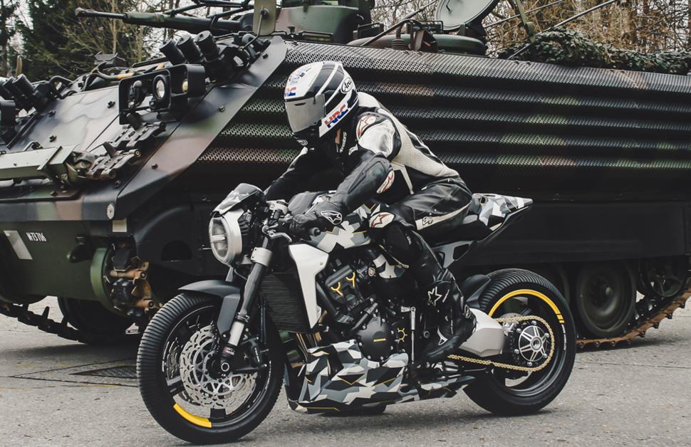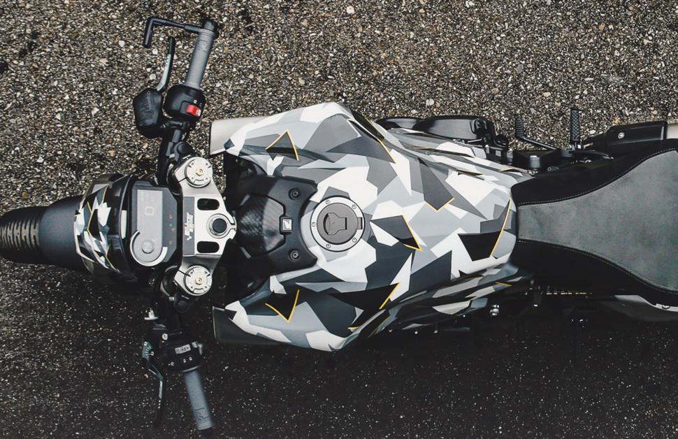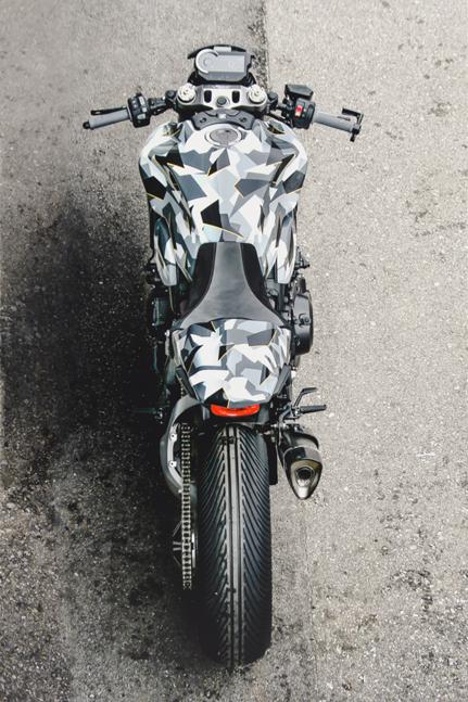 Что касается руля типа клип-он, то компания ABM Fahrzeugtechnik предоставила для нео рейсера руль Multi Clip и рычаги тормоза и сцепления Synto Evo серого и черного цвета в соответствии с цветовой схемой мотоцикла. Также кастом оснащен воздушным фильтром K&N, обеспечивающим богатый приток воздуха: а глушитель Akrapovic из углеволокна отвечает за мощный звук. Если вы думаете, что камуфляжная расцветка мотоцикла нанесена с использованием трафарета, то вы очень ошибаетесь. Это полностью ручная работа, которую мастерски выполнил Уолтер Оберли. Он наносил лаковое покрытие слой за слоем, дойдя в общей сумме до семи слоев, и лишь тогда добился нужного эффекта.