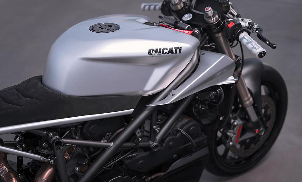 Подглядывая в один из своих прошлых проектов, он сварил подрамник из нержавейки, боковые элементы которого простираются вплоть до решётчатой части рамы Ducati 848 Evo. Затем Крис сделал основу сиденья и отдал другу на обшивку алькантарой. Участки сиденья облегают по бокам стоковый бак, повторяя его силуэт, но агрессивно контрастируя по материалам и отделке.