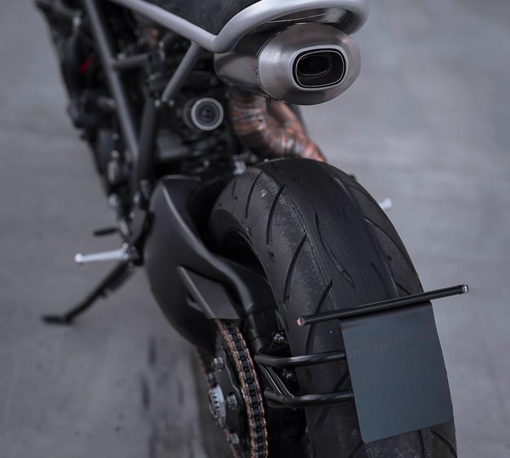 Все функции заднего света выполняют такие же крошечные "точечные" поворотники на кастомном креплении номера, созданном из гнутых трубок и фрезерованных элементов. Кронштейн его идеально облегает заднее колесо Ducati 848 Evo, не нарушая изящества его одностороннего крепления.