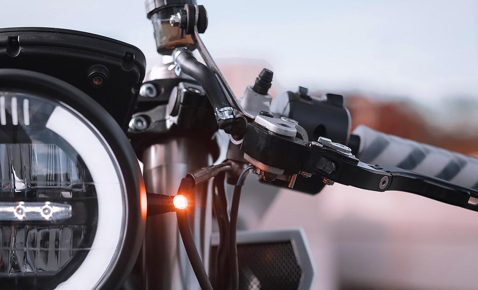 В Германии строгие правила техосмотра, и Крис сохранил все элементы, необходимые для езды по дорогам, но постарался сделать их максимально незаметными и компактными. Позиции круглой диодной фары с ДХО подкреплены настолько крошечными поворотниками, что их не сразу и заметишь. За ней расположены стоковые клипоны с полупрозрачными грипсами Frozen от Hookie Co. поверх графики Motocrew.