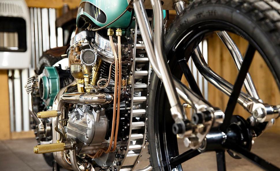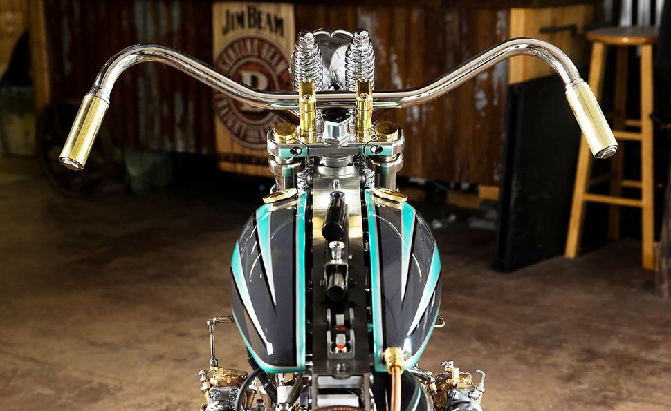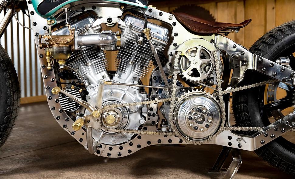 Есть множество других деталей, на которые стоит обратить внимание, от закрученного штока ручного рычага переключения передач до того, как Шон аккуратно установил два тормозных мастер-цилиндра рядом друг с другом. По бокам от опоры Panhead-а стоят карбюраторы Linkert M74B, соединённые напечатанным на 3D-принтере алюминиевым манифольдом, а сдвоенный выпускной патрубок оканчивается интригующим подвешенным снизу глушителем. А если поднять кожаное седло мотоцикла, то там вы найдёте рукоятку ручного стартера послевоенной эпохи.