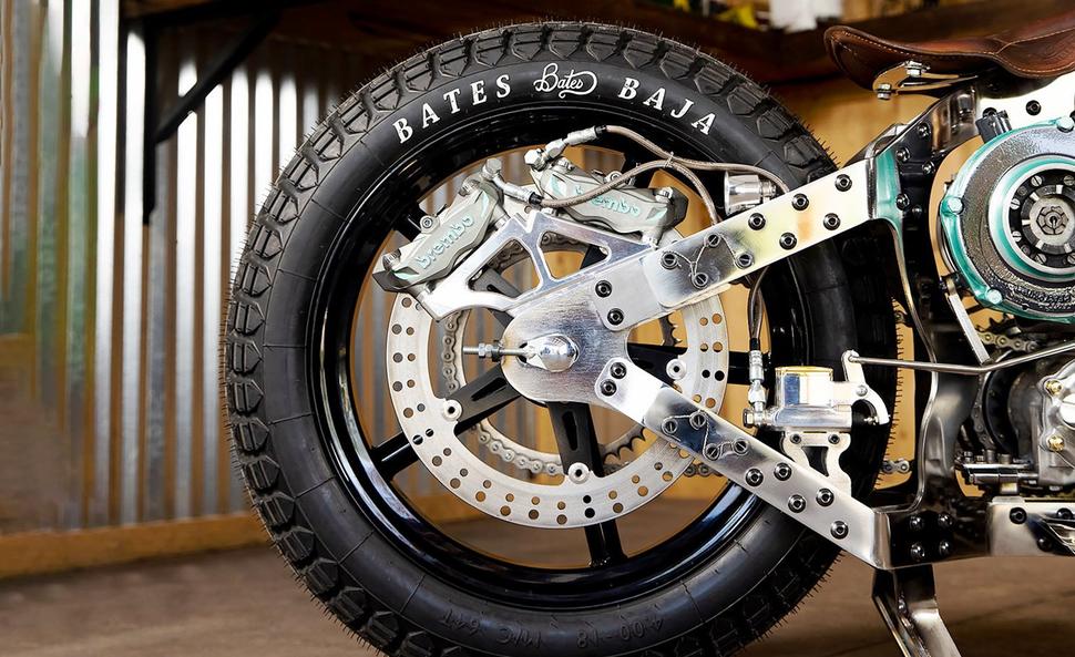 Колёса - это Invaders от Led Sled Customs, обутые в резину W&W Cycles Bates Baja. Переднего тормоза нет, зато сзади стоят два суппорта Brembo на одном диске, прикреплённые к самодельному кронштейну. Звучит глупо, но за этой глупостью стоит хитрая идея.