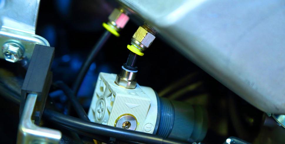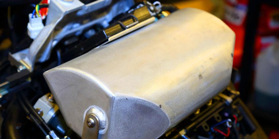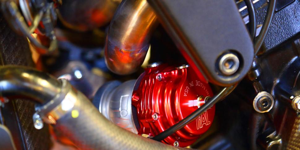 Сейчас в продаже есть масса различных электронных контроллеров наддува, но Шон обошёлся простым ручным регулятором. Повернув его в одну сторону, вы уменьшаете степень наддува, а в другую - увеличиваете. Легкосплавный патрубок ведёт к наддувной камере под баком, которая может быть простенькой, заводского исполнения, а может - фрезерованной, в зависимости от бюджета.