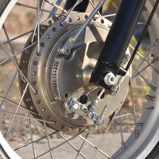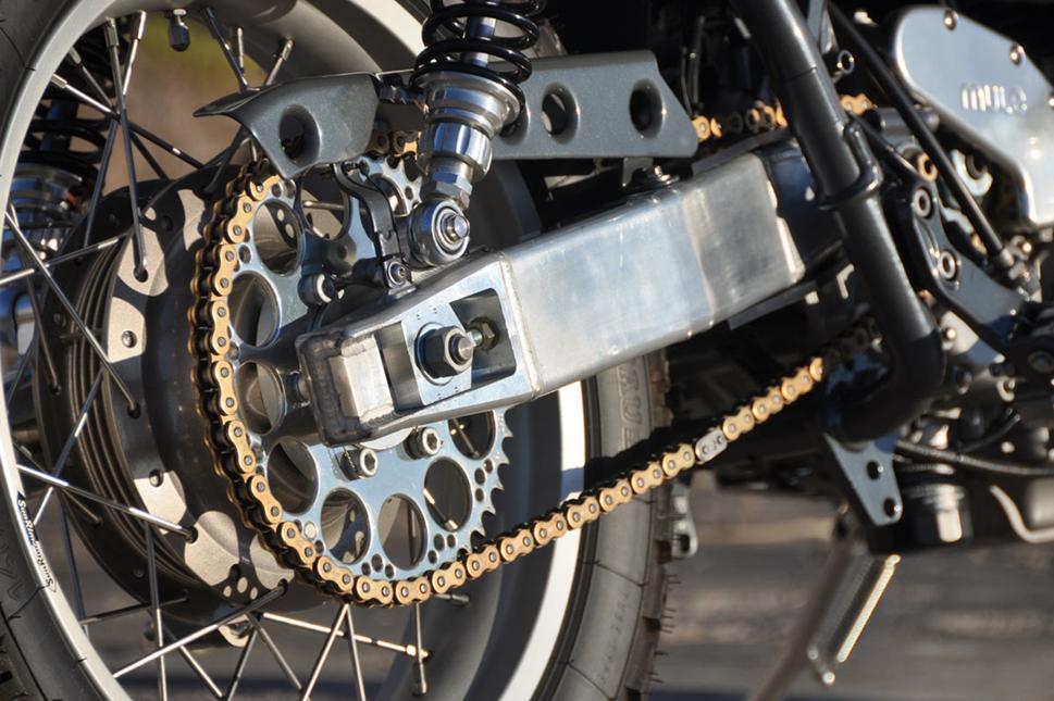 Тормозные диски подверглись полной реставрации, включая расточку для подшипников большего диаметра. Кроме того, двойной тормозной диск плавно переходит в крепление переднего крыла. Что касается задней колодки, то здесь была установлена система от 1976 Yamaha XS650. Она прошла такую же расточку под подшипник большего диаметра, также была установлена алюминиевая звездочка.