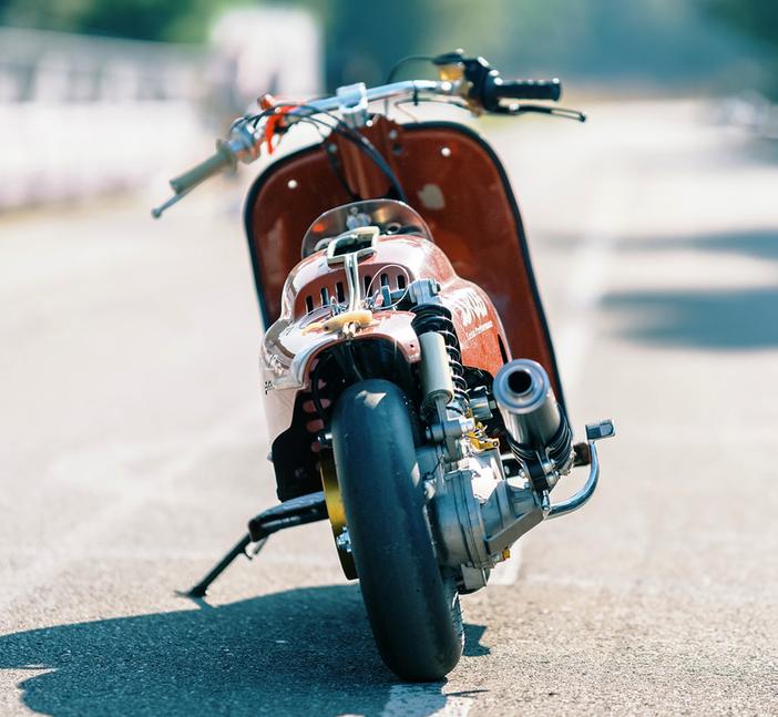 Супер-скутер Криса ездит на 10-дюймовых колёсах: спереди - классическое от Lambretta, а сзади - от крупного немецкого поставщика скутерных запчастей SIP Scootershop. Оба колеса обуты в гоночные слики от итальянцев PMT Tyres. Переднее колесо Крис оснастил дисковым тормозом, использовав главный цилиндр Magura HC3 и армированную сталью магистраль.