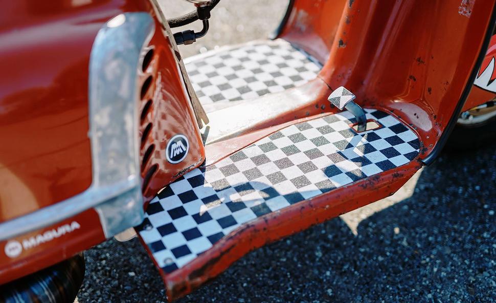 Руль устроен очень необычно: модифицированная трубка руля зажата в выносе от горного велосипеда, а на её концах стоят клипоны. Ручка газа - от Magura, а переключатель передач (он тоже на руле, как и положено классическому скутеру) - от MB Scooters. Перфорированное алюминиевое седло Крис изготовил вручную, а затем придал немного шика полику, педали тормоза и кикстартеру, покрыв их противоскользящей плёнкой для скейтбордов.