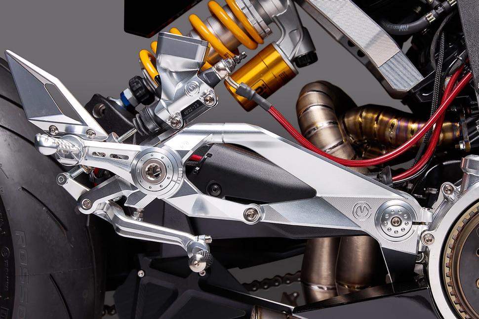 Другие фрезерованные алюминиевые детали предоставлены итальянской компанией Motocorse, изготовившей их по спецификациям VTOPIA. Среди них - траверсы вилки со встроенной системой регулировки руля и парой клипонов, а также кронштейн приборной панели, бачки тормоза и сцепления и спортивные подножки с ножными рычагами.