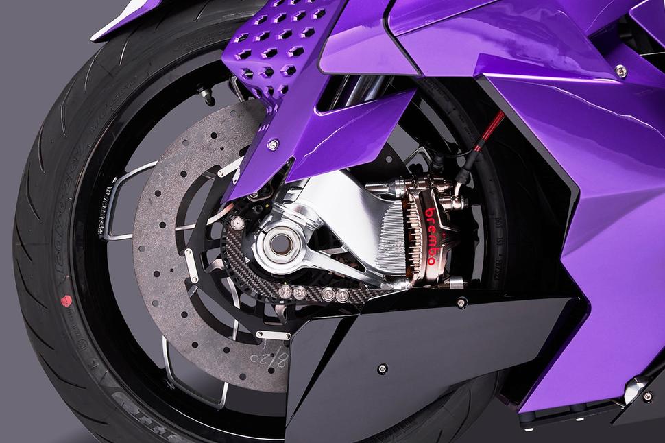 Как и игра, Анима - это упражнение в сенсорной перегрузке. Яркий фиолетовый цвет украшает основную часть облицовки, которая сама по себе таит множество граней и уровней. Обшивка седла разделена на семь частей: яркая алькантара натянута на неопреновые подкладки. Загляните за красочные детали, и вы увидите множество ЧПУ-шных деталей, которые добавляют форме функциональности.