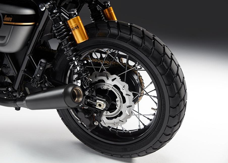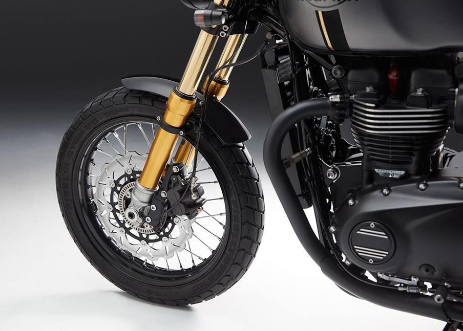 И передняя, и задняя подвеска была усовершенствована. Для передней подвески взяли готовый к установке комплект от Canyon Motorcycles, состоящий из 43 мм вилки Öhlins FG 621 и выточенных на высокоточном станке траверс. Мастера тщательно выбирали вилку, чтобы сохранить ключевой момент: классический внешний вид. Сзади использованы амортизаторы Öhlins TR 964, благодаря которым мотоцикл поднялся на три сантиметра. Спицованые колеса были взяты из собственного каталога Triumph. Они обуты в шины Pirelli MT60, способствовавших небольшому увеличению внедорожных качеств Street Twin.