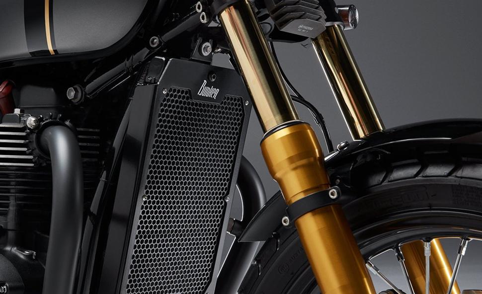 Они предоставили глушители и прекрасный каталитический нейтрализатор, а также руль, хомуты и регулируемые рычаги. А что касается грипс, то было решено установить грипсы Bitwell Inc. Переключатели, спидометр и передняя фара остались родные. Кроме того, Street Twin получил несколько запчастей из каталога Triumph. Например, ревизионная крышка и крышка системы зажигания. А кожух цепи был взят из ассортимента British Customs. Крышка радиатора—собственная работа Bunker.