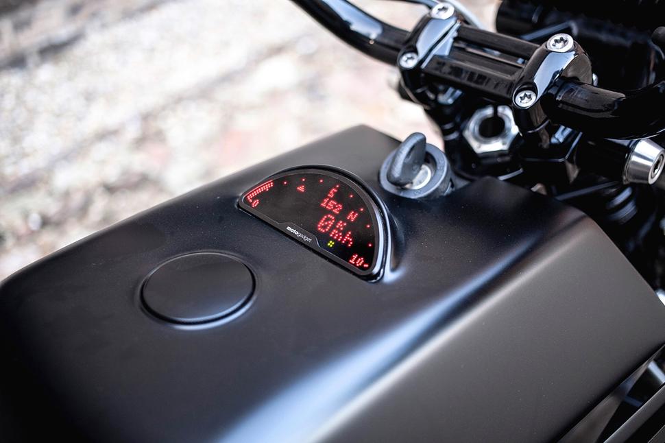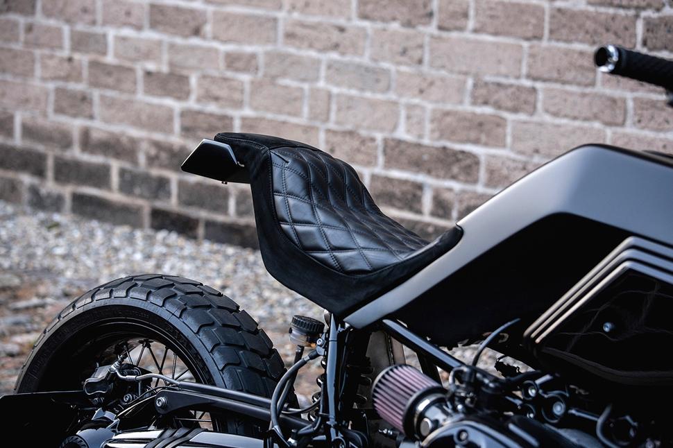 Седло, тоже чёрное, было обшито Miller Kustom Upholstery в кожу с диагональным паттерном, подчёркивающим его силуэт. А чтоб усилить монохромный эффект, все световые приборы имеют прозрачные рассеиватели, причём задний фонарь был изготовлен из прозрачного оргстекла с решётчатым матированием, идеально перекликающимся с решётками мотоцикла, а уже под ним находятся цветные светодиоды. Тот же эффект был достигнут спереди мотоцикла - белый диодный свет сияет сквозь эту безумную переднюю решётку. Приборная панель была заменена на спидометр от Motogadget, встроенный в бак, и одно только это позволило снять с мотоцикла около 10 лишних килограммов железа.