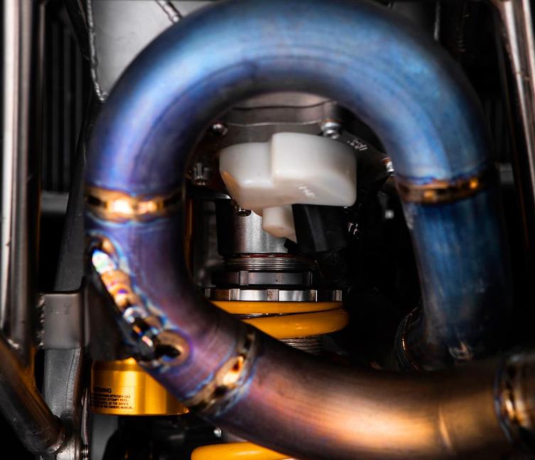 100% титановый выхлоп Devil существенно экономит вес, улучшает производительность двигателя и образует забавную петлю прямо перед кастомным моноамортизатором Ohlins.