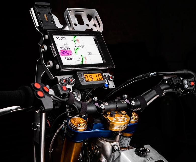 Более очевидное дополнение стоковой комплектации Yamaha WR450F - навигационная панель с прокручивающейся бумажной картой над рулём, отсеком для гоночного репитера (прибор, отображающий навигационные подсказки в формате CAP и/или скорость) и навигатора, которые выдают непосредственно на гонках: раллийные правила периодически меняются, а навигационные приборы регламентированы правилами, поэтому их наличие - забота организаторов гонок. Впрочем, на всякий случай на навигационной панели есть и отсек под собственный навигатор, если гонки допускают его использование.