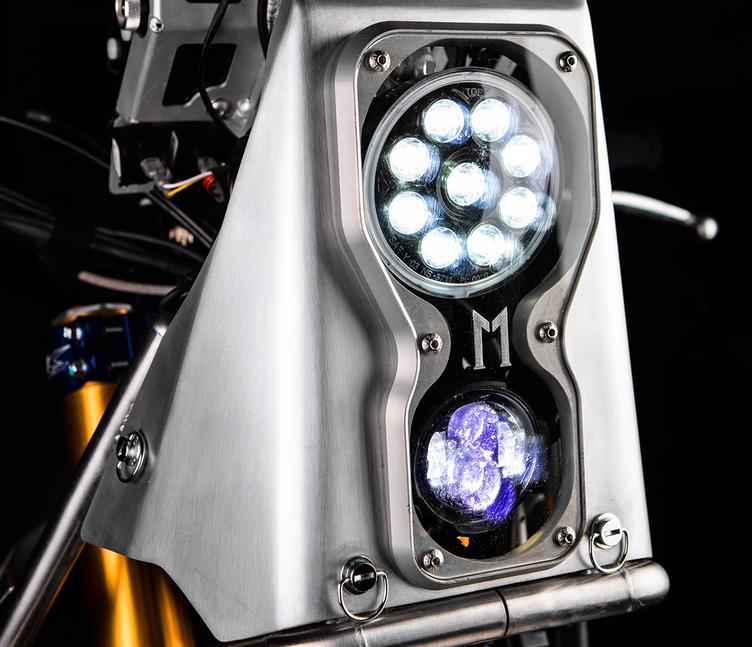 Новые крылья и кожухи вилки Yamaha WR450F также сделаны из алюминия и украшены гравировкой, как и защита картера. В алюминиевый корпус аирбокса встроен бортовой компьютер KMS Can Display, подключаемый по CAN-шине к разным датчикам и настроенный отображать положение дроссельной заслонки, температуры и обороты. Le Motographe установили ЭБУ GET Rally с трекшн-контролем и десятипозиционным регулятором тяги на заднем колесе.