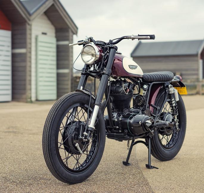 Для начала Пол с Линдой переделали заднюю часть рамы, выпрямив задранный хвост Scrambler-а. Родной задний брызговик был переставлен пониже. Основа стокового седла слишком проржавела, так что супруги сделали новую, обшив её чёрной кожей. Для установки нового седла они немного приподняли задние стойки бака, заодно выведя его нижнюю линию в горизонталь.