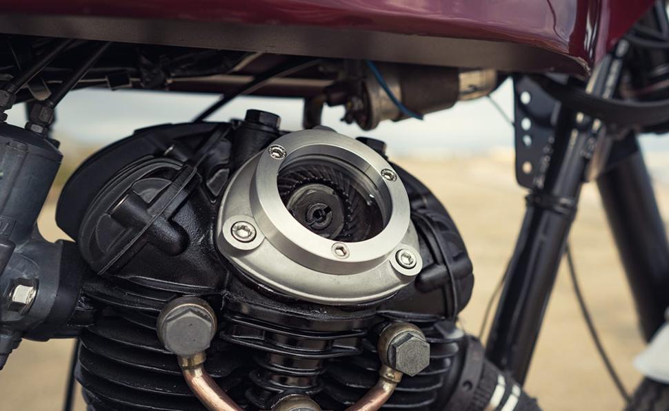 На этих двигателях привод распредвала выполнен с помощью кардана и конической передачи. Зная, что тахометра на мотоцикле не будет, супруги решили сделать что-нибудь необычное с кожухом привода ГРМ. Его сняли, выбрали на токарном станке круглое отверстие и вставили смотровое окошко из оргстекла, прижав алюминиевым кольцом, и теперь можно полюбоваться работой конической передачи, вращающей распредвал.