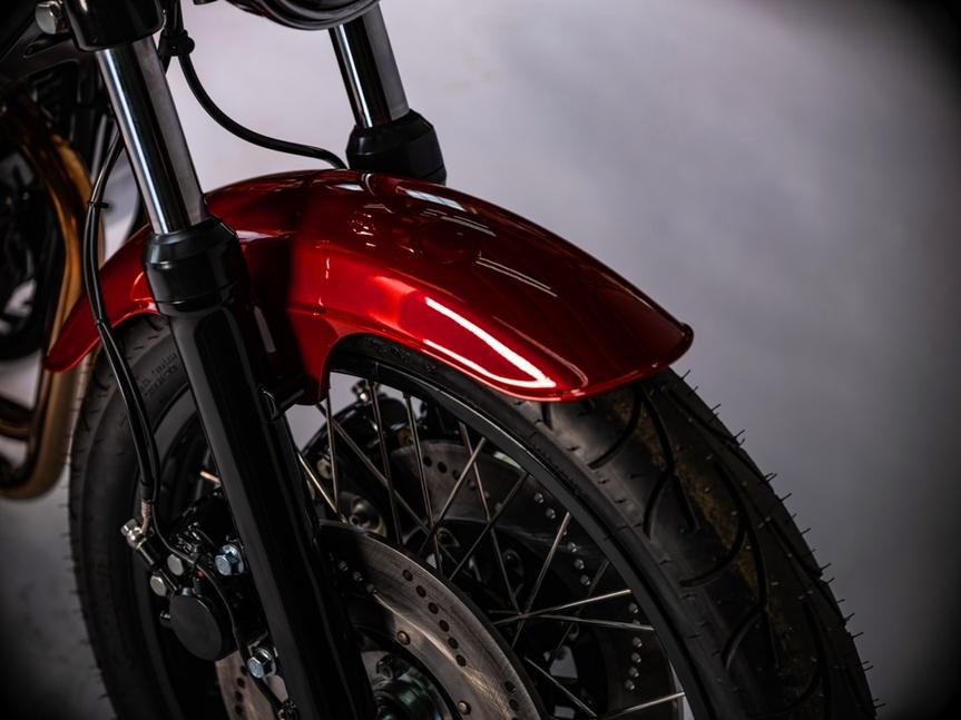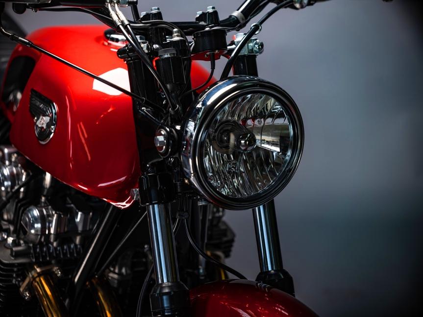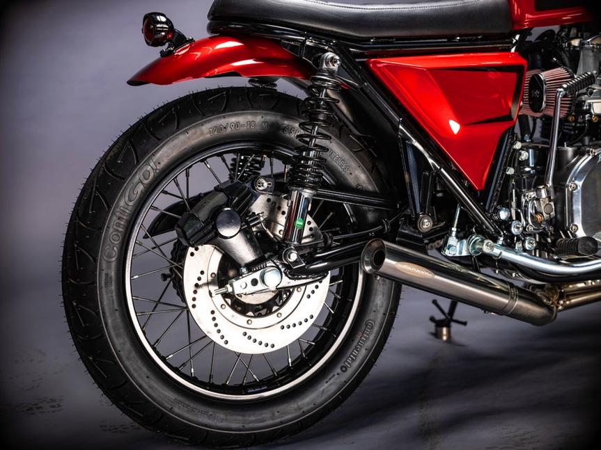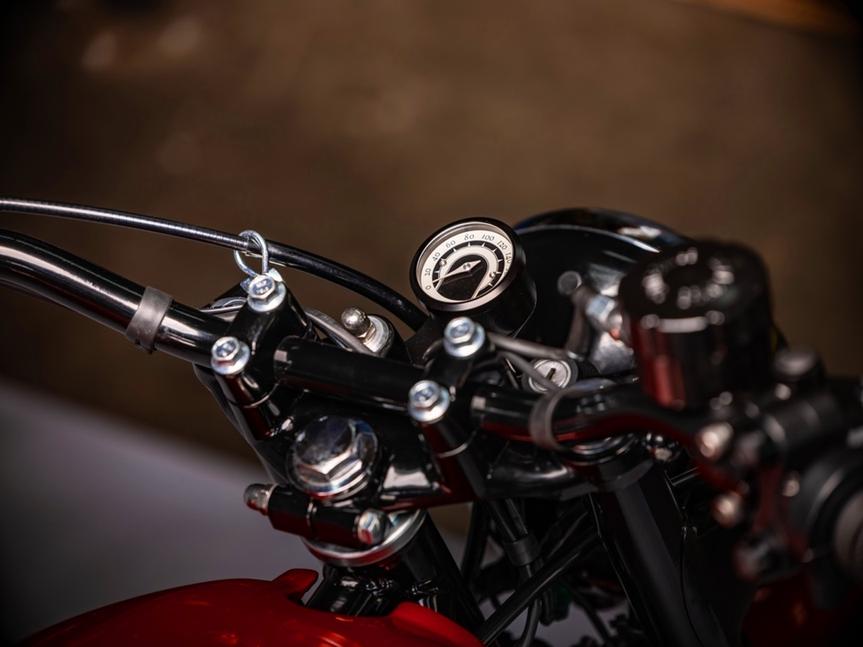 Сборка прошла легко, всё встало как надо. Колёса были переспицованы новыми нержавеющими спицами на новые чёрные обода, а затем обуты в резину Conti Go. Классический миниатюрный спидометр от Motogadget встал идеально, а новая проводка объединяет электрику мотоцикла воедино. Грипсы от Bitwell и афтермаркетные пульты придали рулю ещё более лаконичный классический стиль.