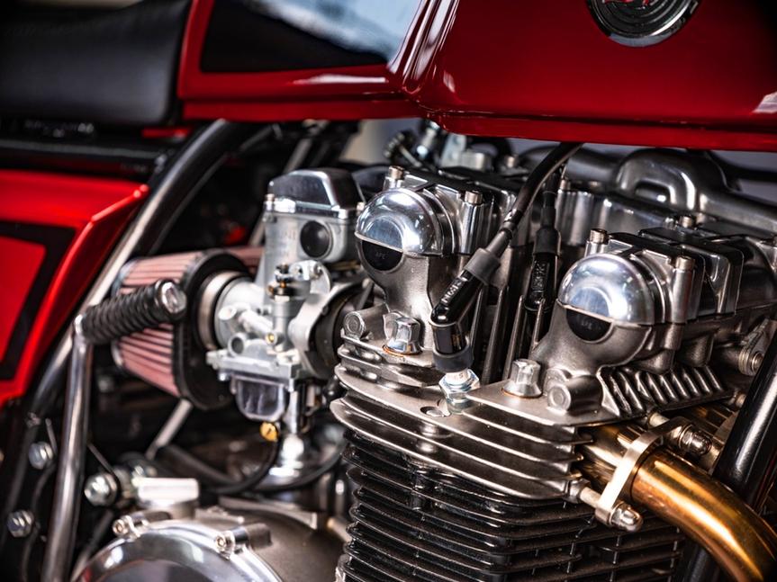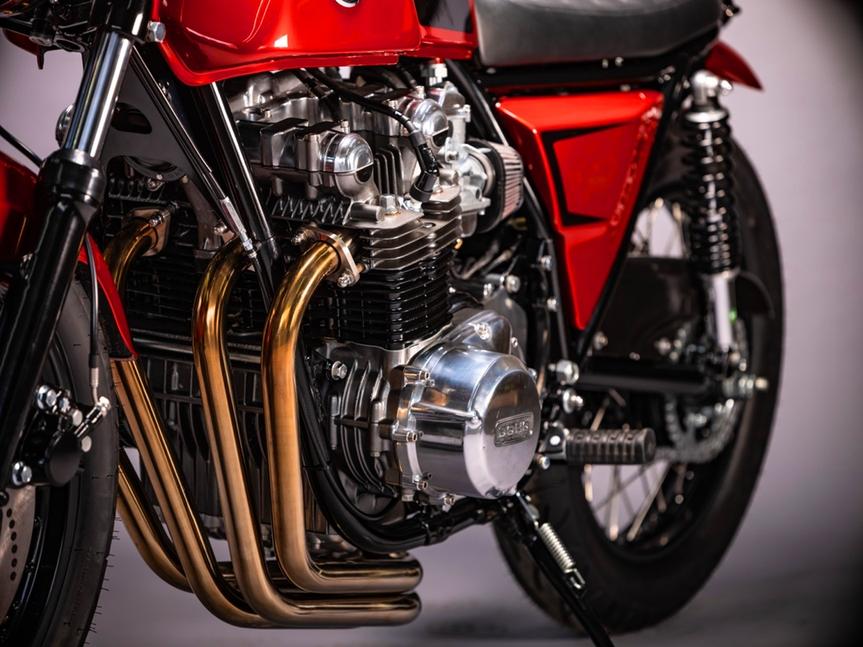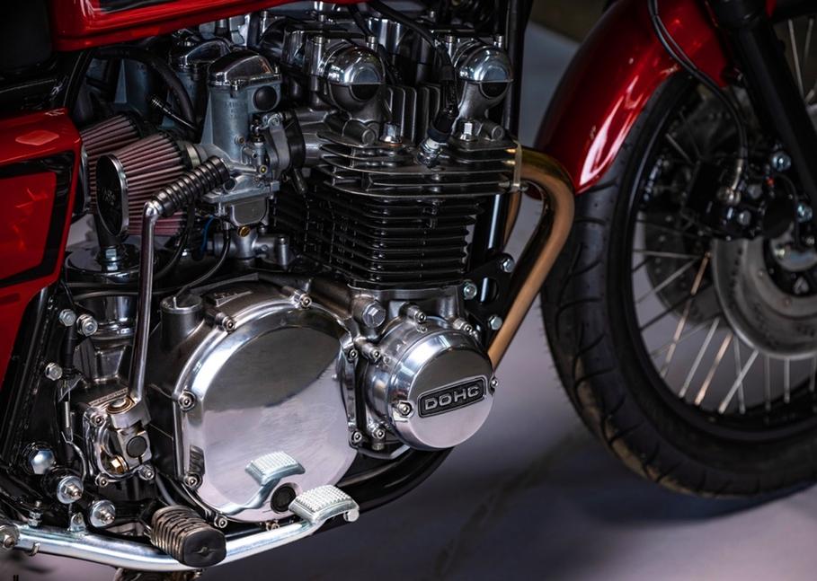 Когда всё засияло, Шон взялся за переборку мотора Kawasaki KZ1000. Он снял головку и увидел, что двигатель в хорошем состоянии. Тем не менее, он отхонинговал цилиндры и заменил поршни с кольцами, а затем собрал на новых прокладках и окрасил, после чего Browning Polishing навели лоску на поверхностях двигателя, отполировав их, а новый нержавеющий крепёж подчеркнул сияние алюминия.