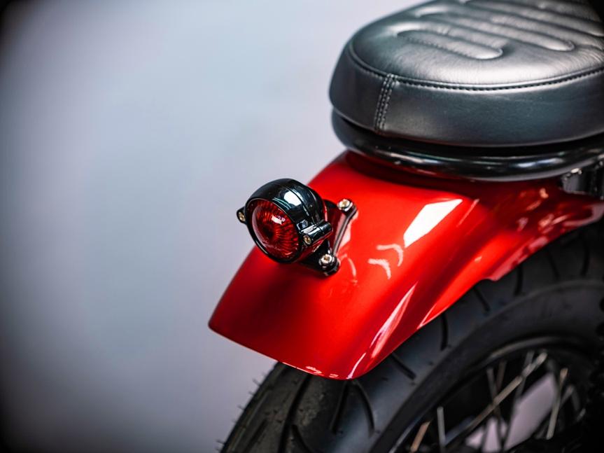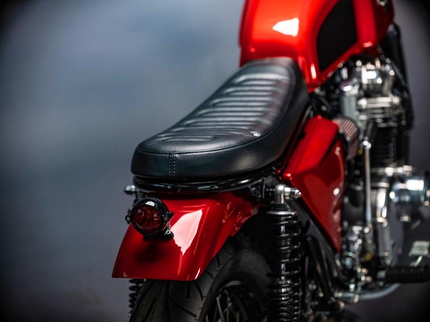 Раму Kawasaki KZ1000 украсила кафе-рейсерная петля, на которой уютно устроилась задняя часть сиденья, и к которой крепится самодельное заднее крыло. К крылу в свою очередь крепится задний фонарь Motone.