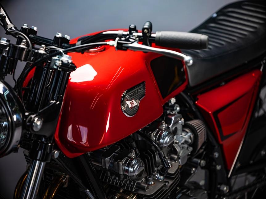 Результат получился просто великолепный - ярко-коралловый Raptor Red сияет на баке от Royal Enfield Continental GT, сильно переделанном для установки на Kawasaki KZ. По внешнему виду и размерам этот бак отлично подходил, а вот его внутренний туннель пришлось полностью переделать, а затем подварить к хребту рамы Kawasaki KZ дополнительные крепления.