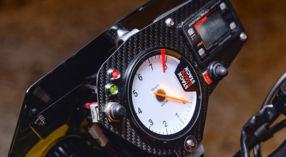 Вилка установлена в модифицированные Кимом траверсы от Ducati с самодельным рулём, гоночным тахометром STACK и цифровым термометром Yoshimura. Литий-ионный аккумулятор питает стартер, галогеновую фару, диодный задний свет и всё остальное, что осталось от электрики.