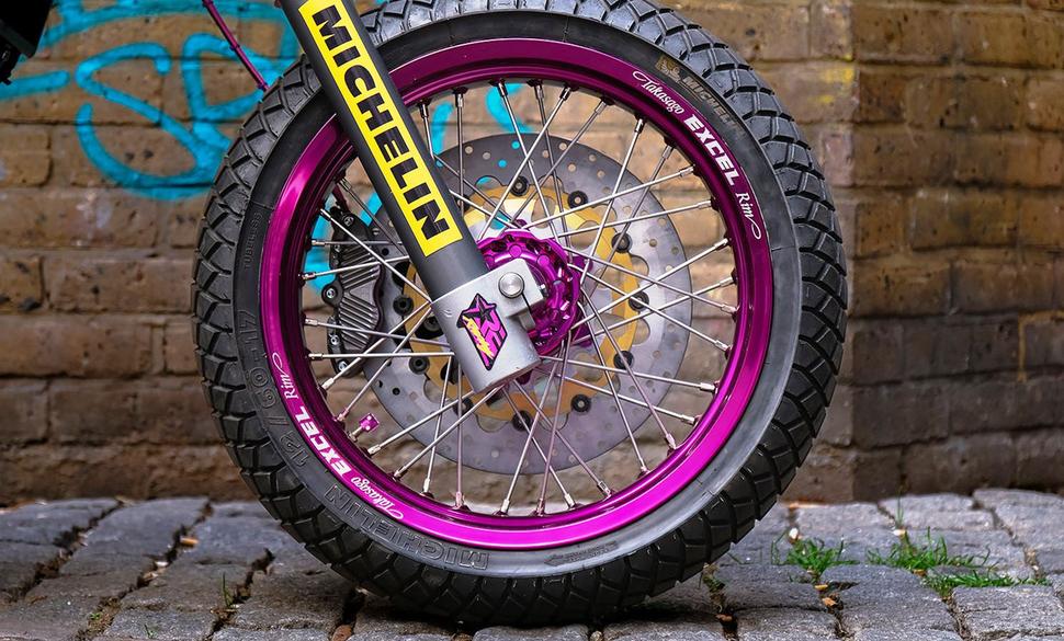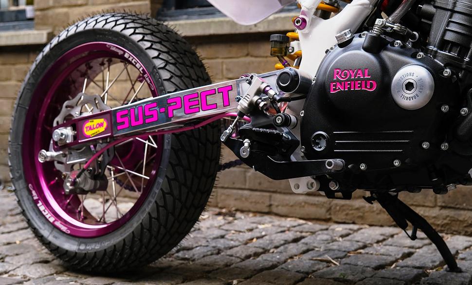 Колёса собраны из ступиц Talon и ободов Excel, обуты в цепкие мотардные Michelin-ы для мокрого асфальта. Тормозные диски - KTM-овские, а остальные компоненты тормозной системы - от британцев HEL Performance, с которыми Мэтт уже сотрудничал в паре проектов. "Они прислали суппорта и машинки, а розовые логотипы я нарисовал уже сам". Ну а розовые шланги для Мэтта сделали CP Racetec… кстати, обратите внимание на цепь - у этого парня, похоже, не всё гладко с головой.