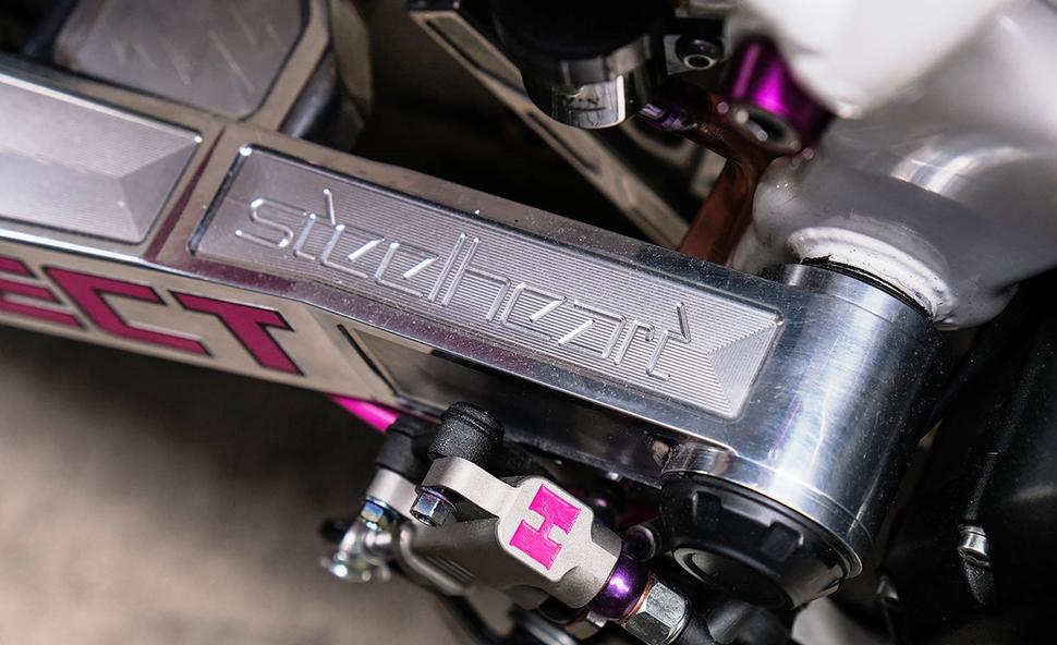 Ещё одно заявление - это фрезерованный из болванки маятник от Steelheart Engineering. Никакой сварки, всё на болтах, с регулировкой длины благодаря сменным элементам, которые можно менять местами, чтобы удлинить или укоротить колёсную базу на 150мм. Массивные перья вилки - от Husqvarna то ли 80-х, то ли 90-х годов с местной мотобарахолки.