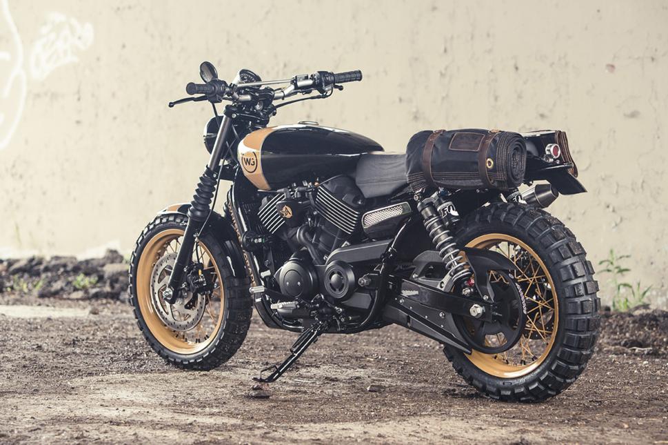 Заднее крыло изготовлено по индивидуальному проекту, на него установили задний фонарь Analog Motor Goods Revolver. Что касается переднего крыла, то здесь оставили стоковое, но модифицировали его. Неброские светодиодные сигналы указателей поворота установили на небольшие опоры по бокам мотоцикла. Следуя мотивам скремблеров, мастера выбрали руль от кроссового байка, ручки Oury и сделанную вручную решетку передней фары.