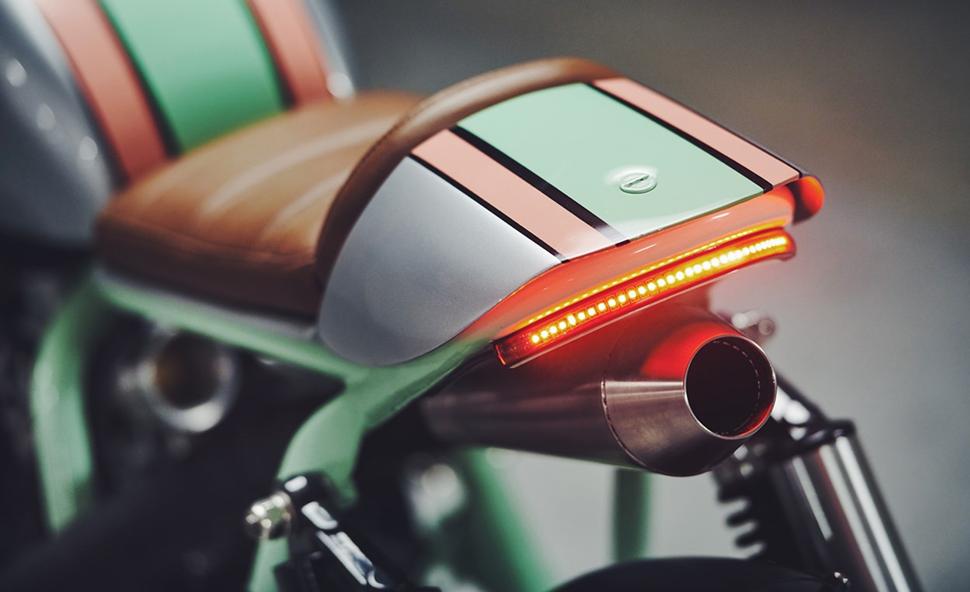 Кастом оснащен контроллером Motogadget, светодиодными приборами освещения, переключателями Posh из Японии и цифровым спидометром Koso, а также грипсами и подножками Biltwell Inc. и рулем Superflow от Renthal.