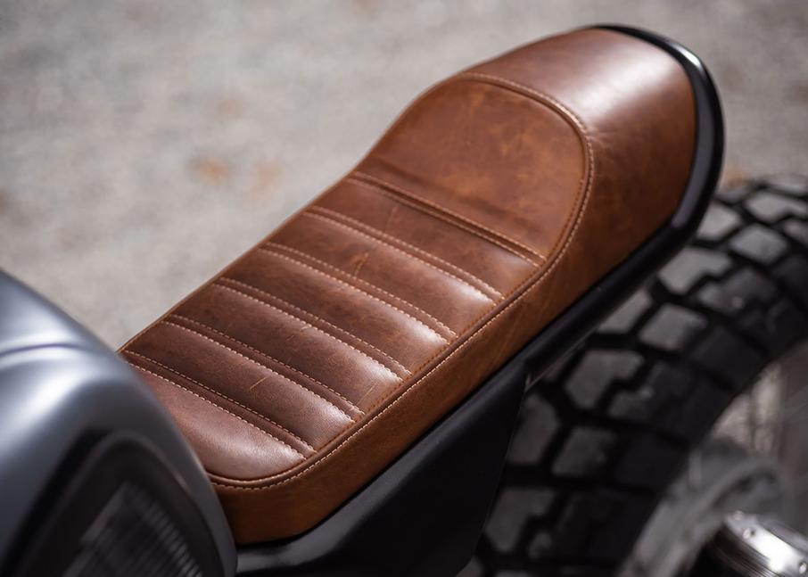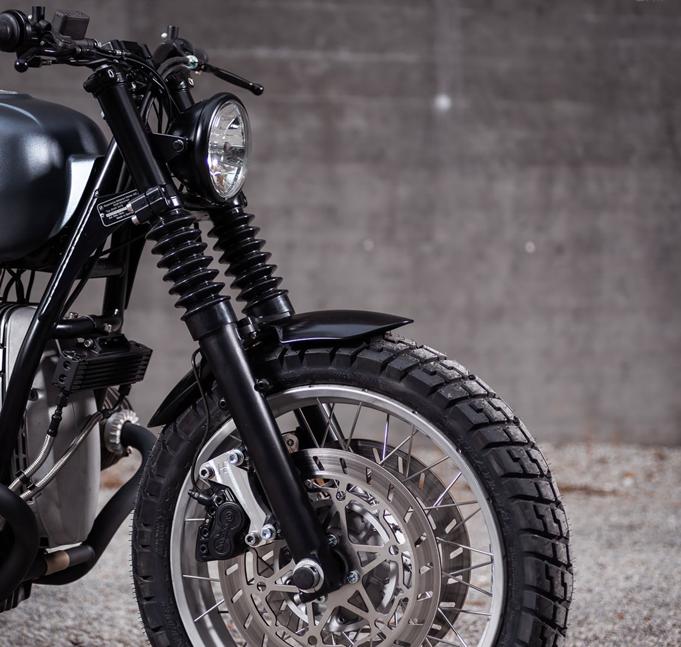 Немного изменилась и осанка BMW. Вилка была значительно переработана: она стала короче на 70 мм, также мастера заменили все внутренние детали и установили пыльники от Honda Transalp. Вилку сначала модифицировали таким образом, чтобы можно было установить новую переднюю фару, а затем покрасили в черный цвет. Кроме того, мотоцикл оборудован переделанным передним крылом от BMW R nineT, изготовленной на высокоточном станке с траверсой и улучшенными тормозными дисками.