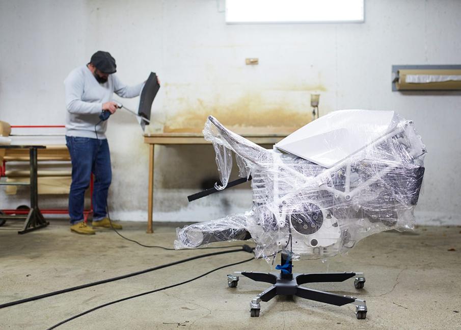 Цветовую схему выбрали черно-белую с небольшими синими акцентами. Мастеру покраски Рико Ульбрехту пришлось взять на себя удар по нависающему дедлайну, но он справился блестяще. Филипп рассказывает, что как только та или иная деталь не требовалась им в течение минимум двух дней, она отправлялась к Рико. Но с такой системой некоторые детали пришлось красить дважды, потому что в процессе сборки они были поцарапаны, в том числе топливный бак и часть обтекателя.