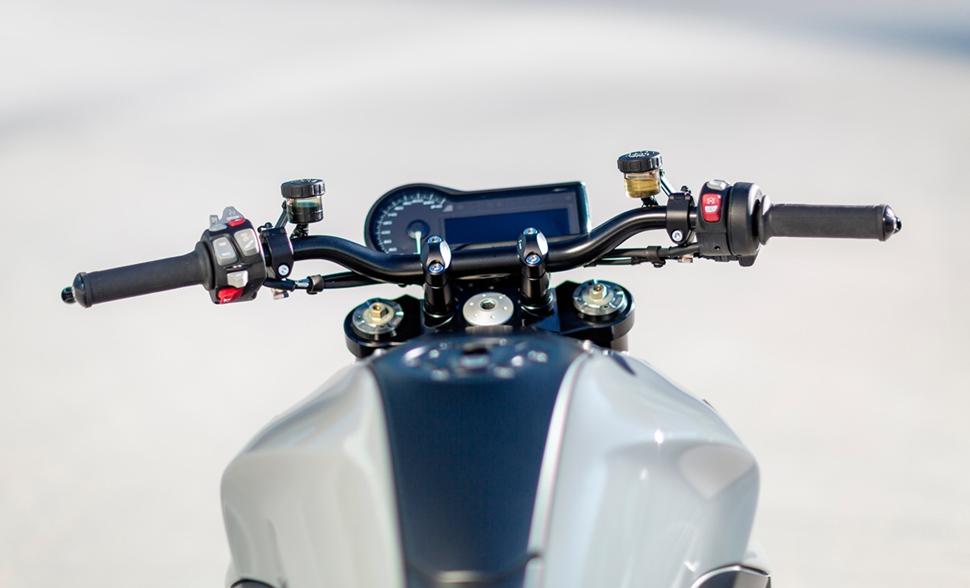 Ронна также установил регулируемые проставки от Rizoma и руль S1000XR. Новые главный тормозной цилиндр Magura -последний элемент в системе управления мотоциклом.