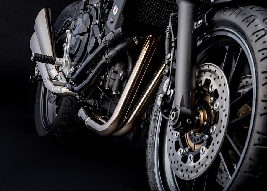 Также Грег заменил боковые панели радиатора и перенес задний резервуар с тормозной жидкостью. Теперь он расположен под одним из номерных знаков. Также на мотоцикл установлено переднее крыло Rizoma и заднее крыло Puig. На фоне всех этих изменений стоковый цифровой спидометр выглядел, как белое пятно, поэтому его заменили на круглый спидометр от XSR. Также на мотоцикл установлен руль Triumph Speed Triple через проставки Pro Taper, грипсы Biltwell Inc. и зеркала заднего вида, которые расположились прямо на ручках. Выхлопная система изготовлена полностью из нержавеющей стали Джейком Грином из Mantra Moto. Глушители Cone Engineering были распилены под углом, вдохновением для чего послужили мотоциклы MV Agusta Brutale. Майкл намучился с коллекторами, чтобы выпрямить их, все ради более классического вида.