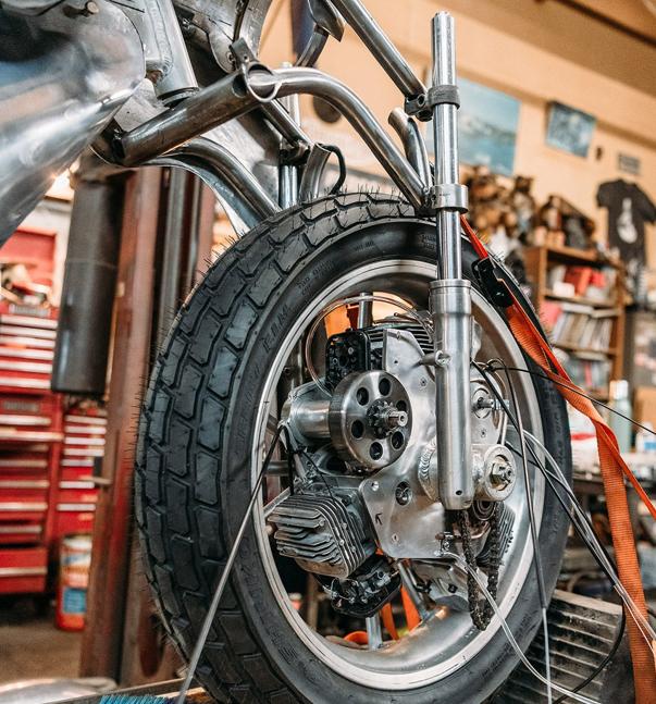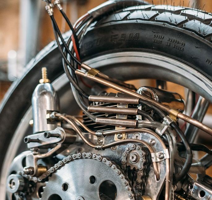 Он просто ходячая энциклопедия в том, что касается колес. Именно Мэтт смог найти комплект колес размером 3,5 на 19 дюймов с неглубокой центральной частью, что обеспечило еще немного дополнительного места. К тому же, переднее колесо является уникальным, потому что спицы расположены только с одной стороны, поэтому топливным шлангам и тросам управления ничего не мешает.