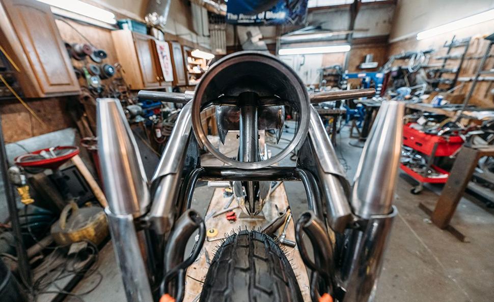 Когда со всем механическим искусством было покончено, пришло время ступить на более знакомую территорию: сделать шасси из подручных материалов. Крейг сделал алюминиевую решетчатую раму, при этом перья вилки были расположены вертикально. С такой конструкцией колесная база остается неизменной вне зависимости от движения вилки вверх-вниз.
