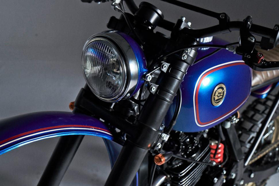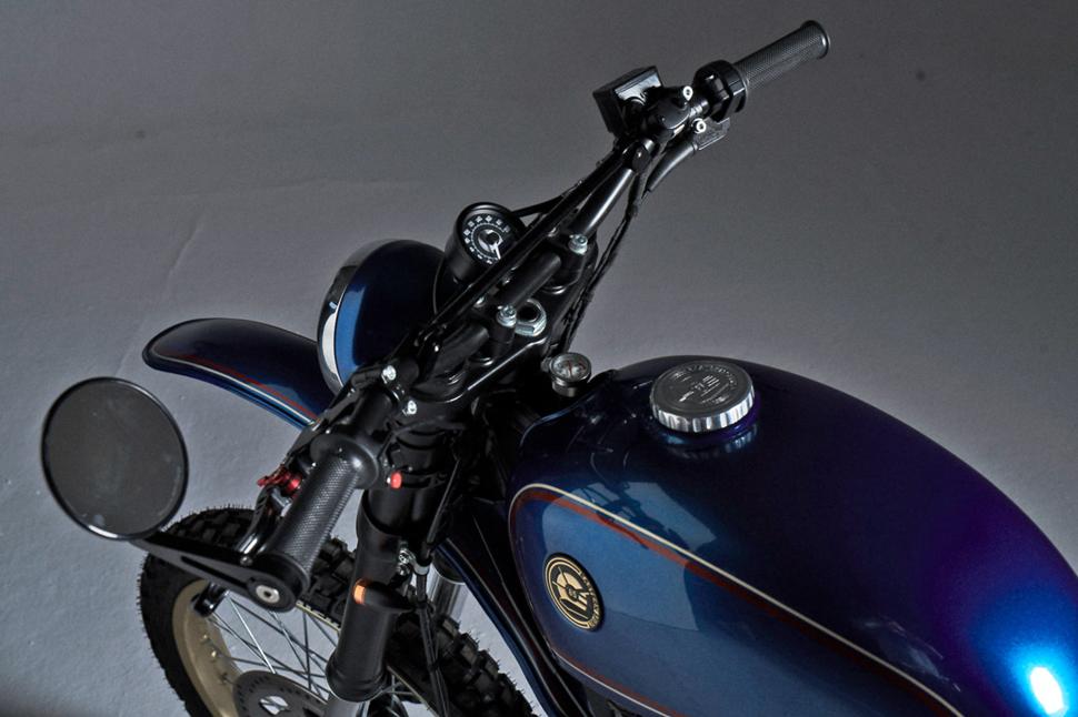 Источником вдохновения для этого скремблера послужила страсть к мотокроссу - дизайн нарисовался сразу. За основу был взят Honda NX650 1996 года в среднем состоянии. Сперва мотоцикл разобрали до рамы и отрезали заднюю часть. Рычаг и амортизатор были сняты и брошены в металлолом. Взяли старый топливный бак ныне не существующей польской компании SHL и немного модифицировали. Раму тоже модифицировали, чтоб бак сел ниже и гармонично смотрелся. Последним штрихом стал созданный «с нуля» задний подрамник. Скремблер получил роскошное «олдскульное» кожаное сиденье. Переднее и заднее крылья сделаны вручную и органично сочетаются со старым польским баком. Все эти детали покрашены в семь слоёв краской, которой обычно красят автопроизводители флагманские модели, а темносиний цвет и яркие полосы превращают бюджетный Dominator в дорогую игрушку.