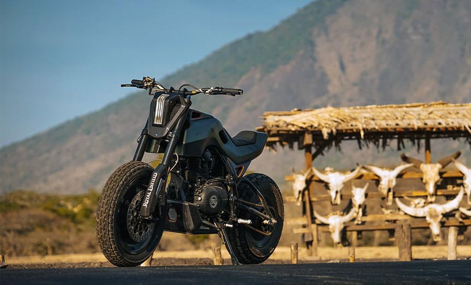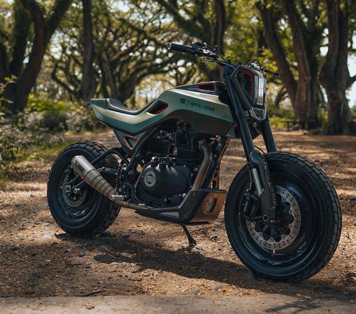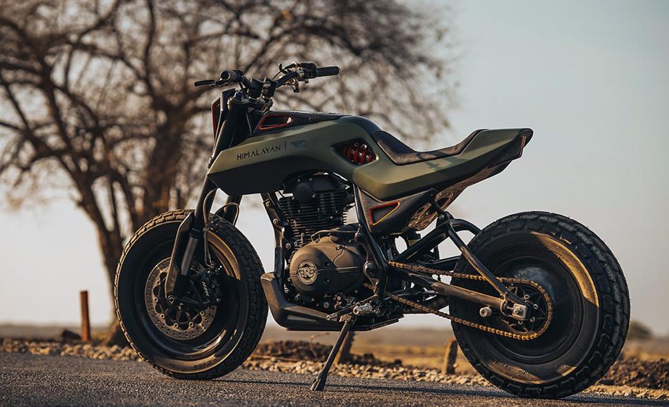Создатели кастомов любят простоту. Именно по этой причине модель Himalayan стала отличным вариантом для создания кастома: с нее легко снимается обвес, и не возникает никаких проблем с электроникой. Итак, британское отделение Royal Enfield обратилось за помощью в кастом-ателье Smoked Garage. Мастер Нико Айгерт говорит, что благодаря высокой проходимости Himalayan из него получился бы отличный мотоцикл в стиле флет-трекеров. Но в Royal Enfield хотели получить на выходе современный мотоцикл, по которому сразу было бы видно, что он из Smoked Garage. Тогда мастера решили сделать ставку на армейское наследие Royal Enfield и придать мотоциклу черты истребителя: сделать его обтекаемым и футуристичным, но в то же время мощным и добротным. Им удалось это настолько хорошо, что в получившемся кастоме в принципе тяжело угадать Himalayan.