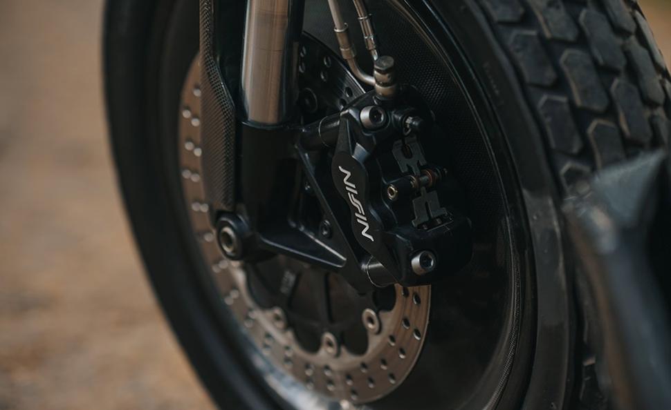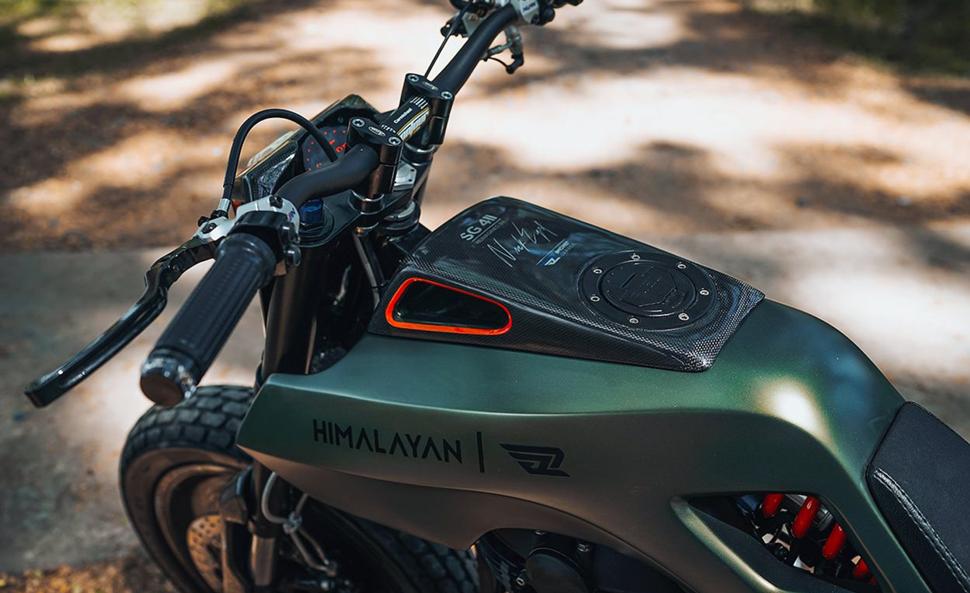 Самое значительное изменение коснулось подвески Royal Enfield Himalayan. Стоковую 41-миллиметровую вилку заменили на более мощную 43-миллиметровую вилку Showa USD. Что касается моноамортизатора, то теперь мотоцикл оборудован амортизатором Öhlins с выносным резервуаром, который соединяется с маятником. На кастом установили новые спицевые диски, только спицы закрыты карбоновыми панелями. Это было сделано для того, чтобы придать мотоциклу более современный и агрессивный вид.