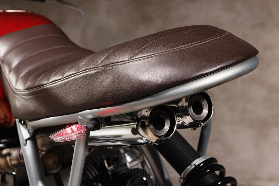 Все неуклюжие панели кузова были убраны, их заменил классический топливный бак BMW и уникальное кожаное седло. Новое сиденье расположено на подрамнике, который подвергся тотальной переделке: теперь нет места для пассажира. Спереди установлено литое крыло, сделанное вручную, оно защищает пилота от брызг, летящих из-под колеса.